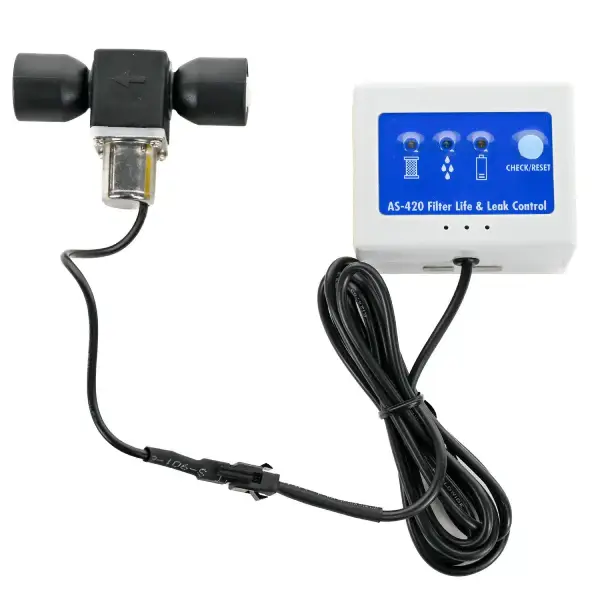 The AS-420 is a compact leak detector and leak controller designed to protect your home from costly water damage while helping you stay on top of filter changes. It’s an ideal safety upgrade for any undersink water filter or reverse osmosis water filter system, offering peace of mind even when you’re not home.