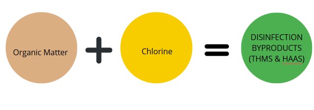 When chlorine reacts with naturally occurring organic matter (like decaying leaves or other materials in the source water), it forms Chlorine Disinfection Byproducts (DBPs), including substances such as trihalomethanes (THMs) and haloacetic acids (HAAs).